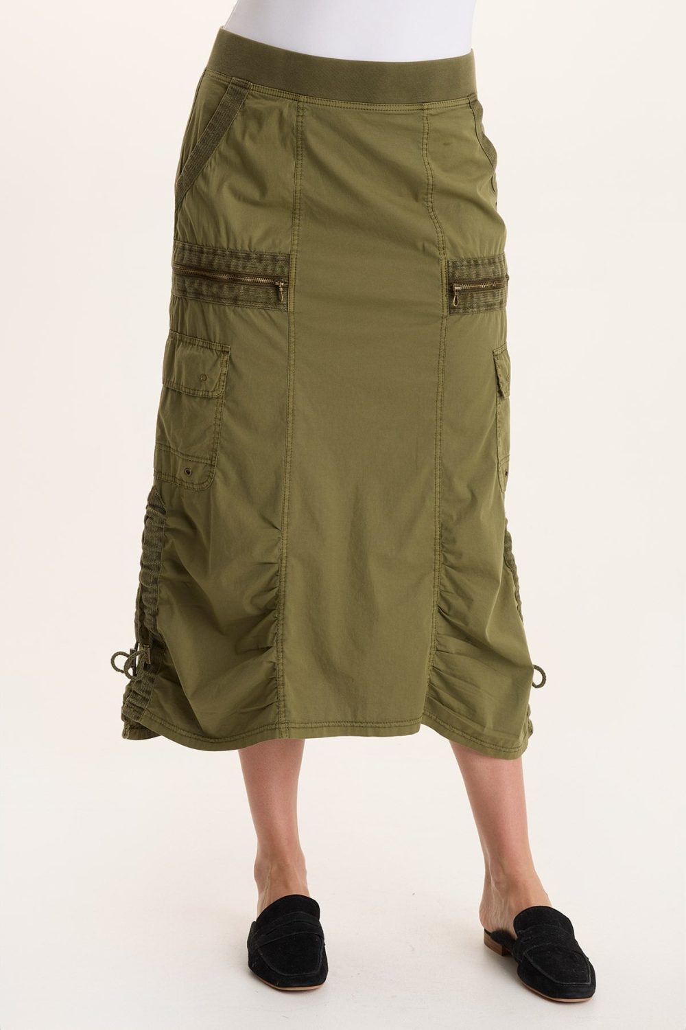 Three panels, ruching, and adjustable cinching on either side create a unique waved hem and lightly voluminous silhouette for this cargo midi skirt. Complete with a pull-on elastic waist and antique brass hardware-detailed pockets throughout, this Brio Poplin style is ready for action!