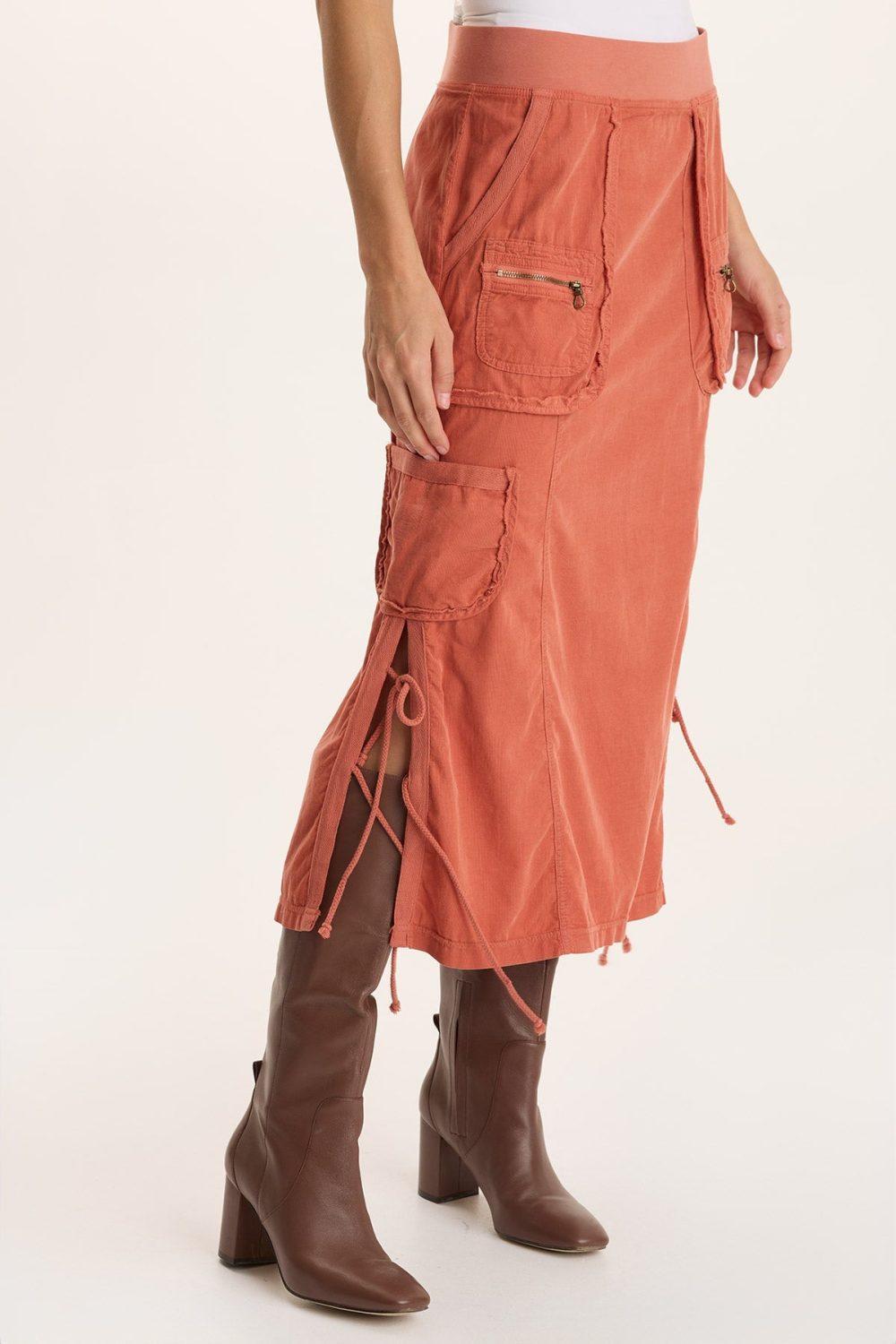 A pull-on cargo midi skirt in the season’s quintessential corduroy, Sisu features side slits with adjustable ties, and generous layered pockets with distressed details for a rugged edge. A clean hemline keeps things polished and versatile.