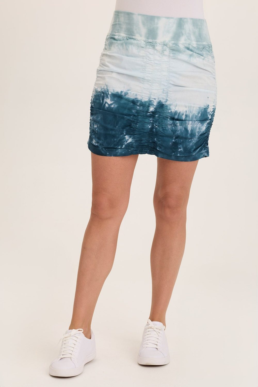 Easy, cozy and flattering, this skirt features a pull on jersey waistband and ruching at sides, front and back for a flattering look.